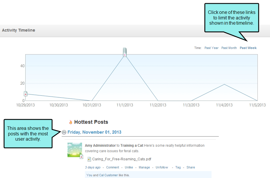 Select Pulse > Timeline to open the Activity Timeline page. This shows a list of Pulse activity in chronological order. You can click the links at the top right-side of the page to limit the activity shown in the timeline to the Past Year, Past Month, or Past Week. The posts with the most user activity appear under Hottest Posts.