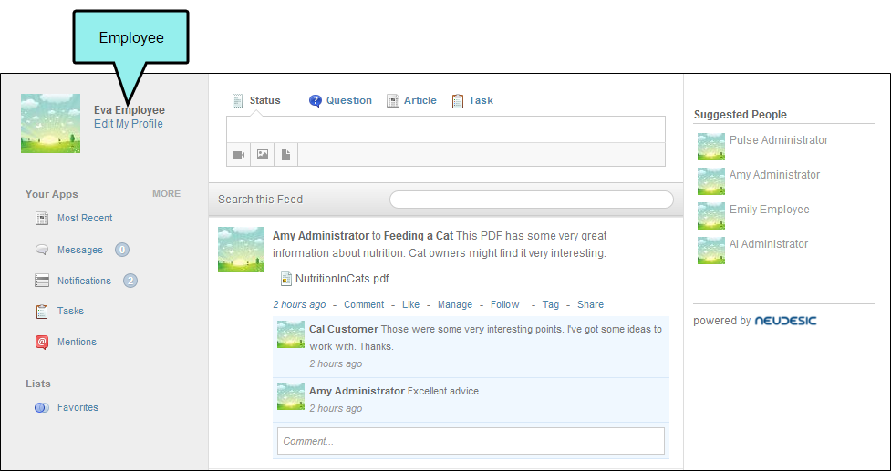 Select Pulse > Home to open your personalized Home page. The options available to you in the Home page depend on your user account's group membership. See Managing Groups.