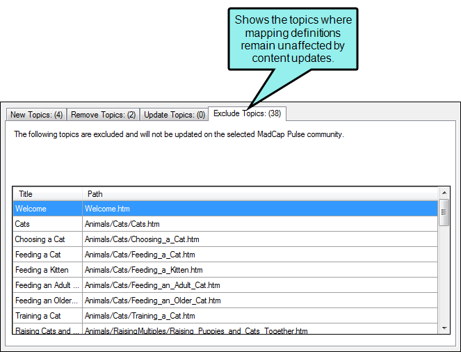 Let's say you have a topic with the file name, "Feeding_Cats.htm" and you decide to rename it, "Feeding_a_Cat.htm." When you make this change, the Remap Community Topics dialog will list this change in two places.