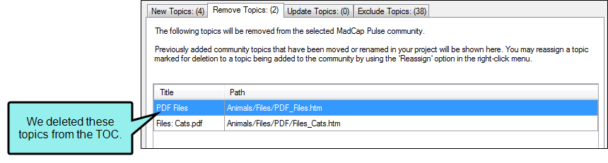 Click Remap Topics. This opens the Remap Community Topics dialog so you can review the updates. In this example, we've renamed a topic file from "Feeding_Cats.htm" to "Feeding_a_Cat.htm."