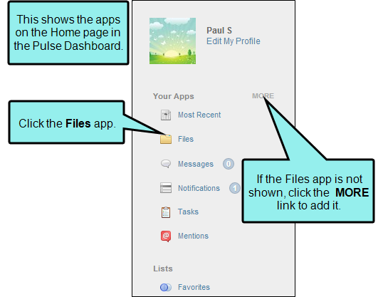 • Files App The Files app works like a file sharing service within Pulse. Administrators and Employees can use the Files app to share files in either their personal user feeds or in a group feeds.