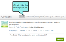 The Questions app gives you the ability to read the questions that have been posted to a specific group, tag, topic, or user feed. If you are a member of the Administrators group, you also have the ability to delete the questions and answers that have been posted.